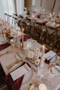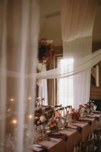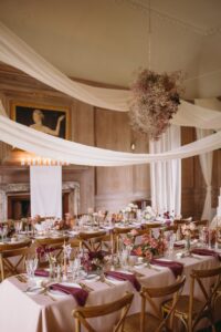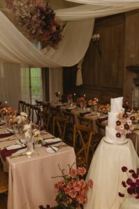 The highlight of The Ballroom was undoubtedly the floral cloud that hung above the tables. Created with light and airy gypsophila in shades of deep pink and plum, with vibrant pops of coral woven throughout, the cloud added layers of drama and elegance. The draping artistry intertwined through the floral cloud gave the entire room an ethereal, romantic feel while creating a focal point that guests couldn’t stop admiring.