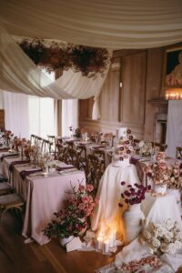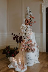We designed in an en-masse style, grouping colours and floral varieties for maximum visual impact. This method allowed the florals to make a statement without overwhelming the venue’s features. The contrast between the rich hues and the soft, neutral tones of The Hall and The Ballroom was striking, creating an unforgettable aesthetic that felt modern yet timeless.