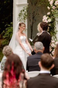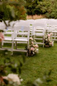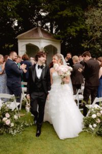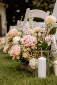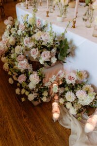 Down the aisle, I created abundant flower-filled meadows that lined Francesca’s path, giving her an incredible walk down the aisle. The flowers framed the ceremony space beautifully, reflecting the couple’s personality—fun, relaxed, and full of romance.