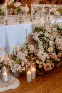 We layered the meadows on Perspex plinths to create a modern look with plenty of depth and dimension. Pillar candles and flowing linens were added to soften the overall aesthetic and create an intimate, romantic atmosphere in the Castle Barn. The end result was a stunning display that not only provided Francesca and Oliver with beautiful photos but also created a focal point for their guests to enjoy throughout the evening.