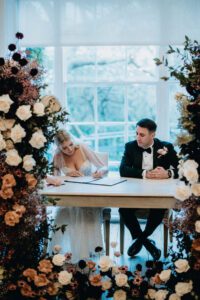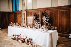 Take a look at Sophie and Ben’s wedding flowers with their deliciously dark colour palette to see how we moved their ceremony backdrop into their wedding breakfast. Framing you as a couple shouldn’t stop after the ceremony – you’re the stars of the show, after all.