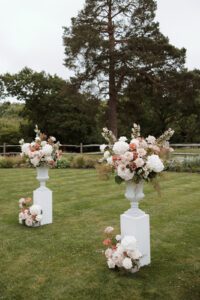 A great example of this was at Northbrook Park, where I first crafted a statement ceremony backdrop composed of two columns and a series of single trays. I then moved the columns outside to frame my couple as they had their portraits taken – click here to see this design in detail*, and to see how you would never know they were the same flowers.
